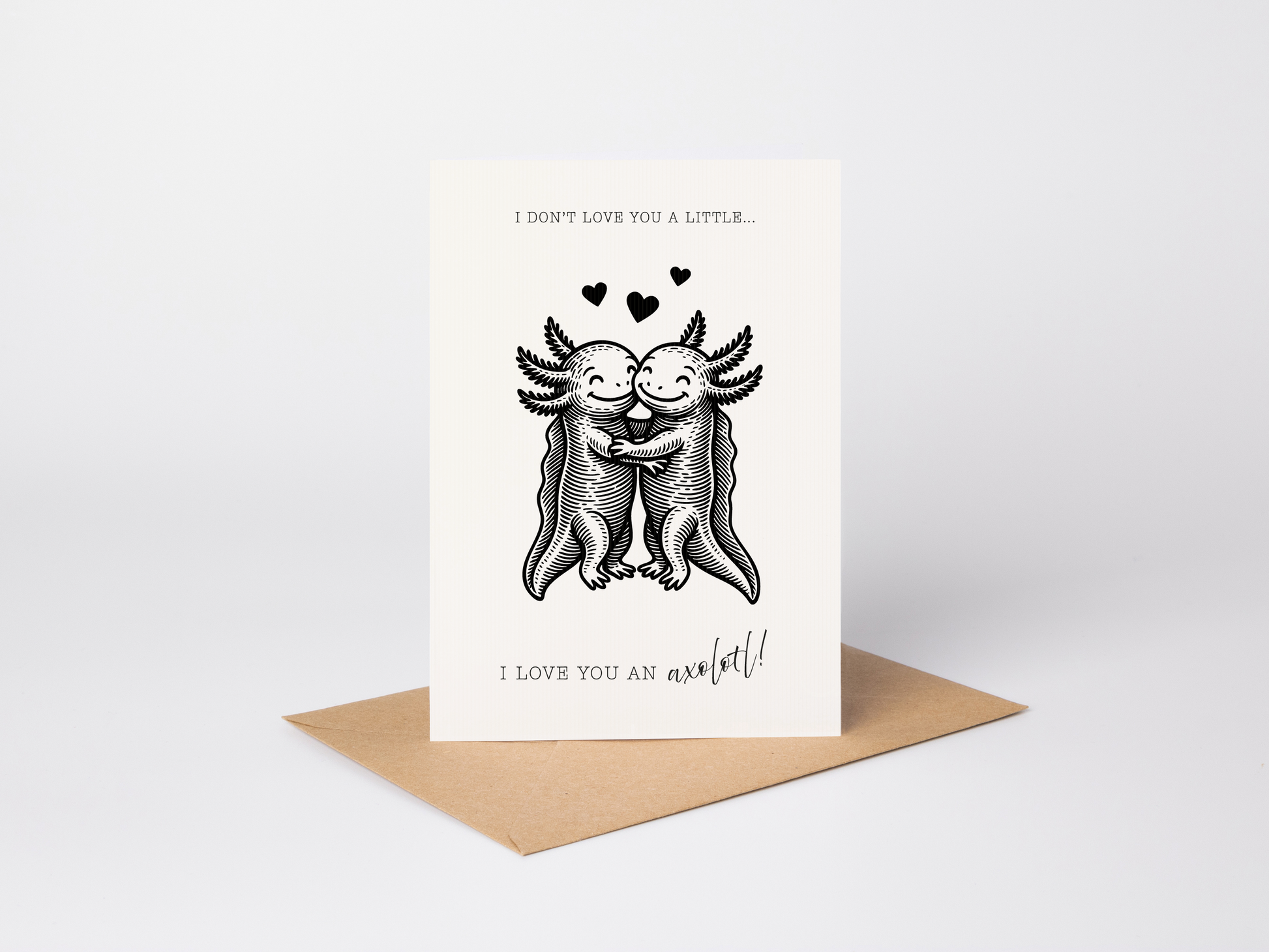 An adorable axolotl card featuring two of these cute (and a little weird!) creatures hugging it out - because sometimes words aren’t enough to say how much you care. The perfect minimalistic style, perfect for your partner, bestie, or anyone who makes your gills wiggle with joy.
