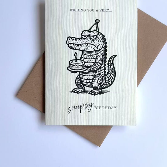 This grumpy little croc might not look thrilled, but deep down, he’s all party… really! Featuring a party-hat-wearing crocodile (or alligator, if you prefer) holding a birthday cake with a classic deadpan expression, this card delivers warm(ish) birthday wishes with bite and charm. Perfect for friends who appreciate a bit of sarcasm and sass with their cake. 'Have a snappy birthday!'